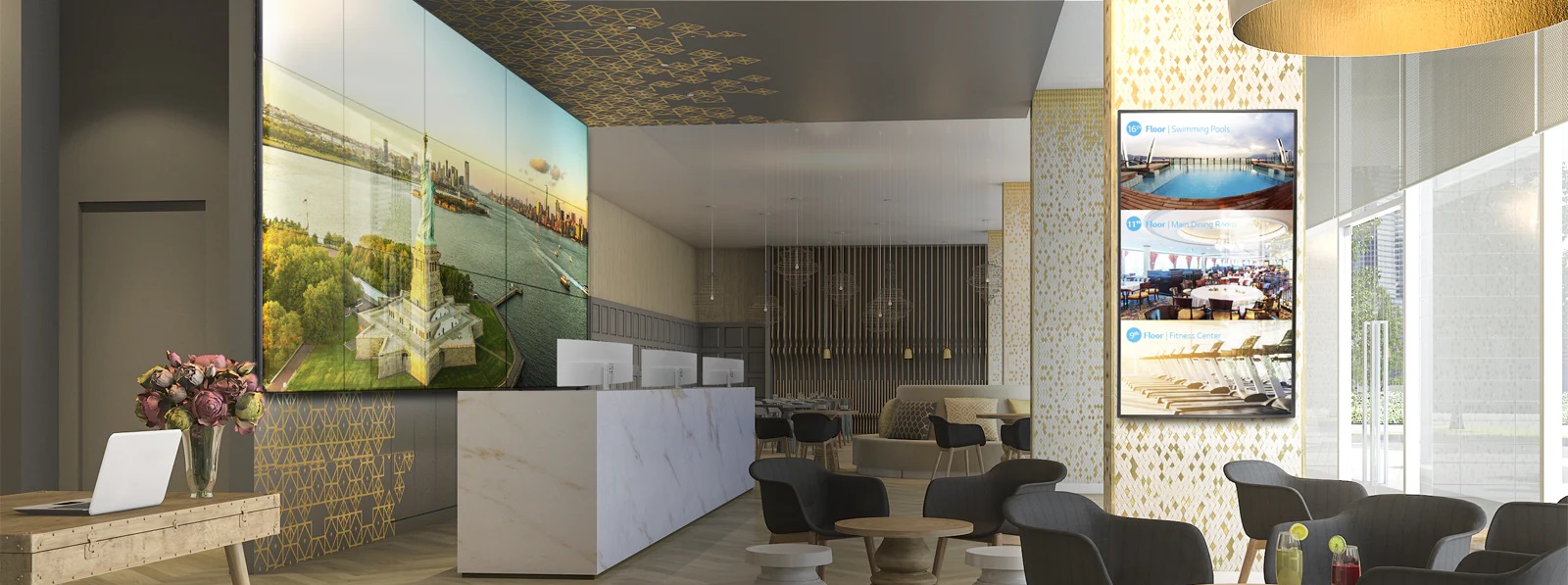 From the lobby to the guest room and fitness rooms to conference rooms, LG hospitality displays are a stunning and versatile way to communicate and entertain across your entire facility, especially when integrated management systems make it easy to update content and settings quickly.